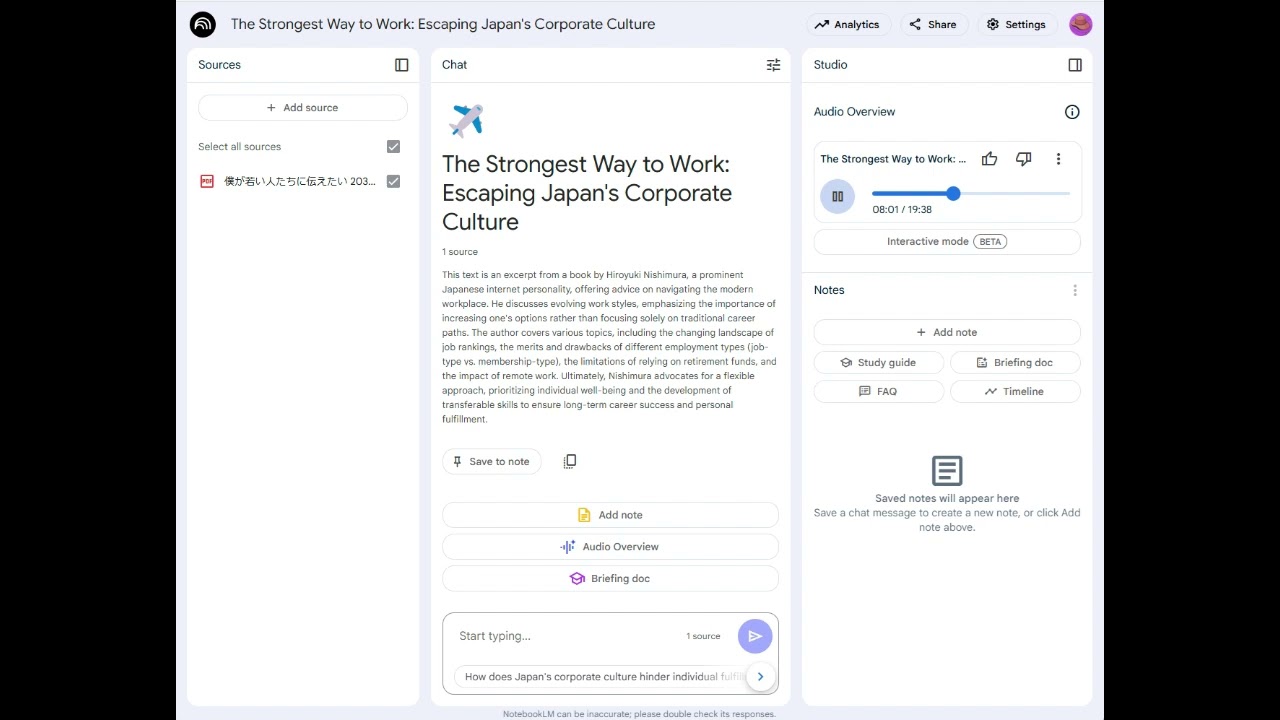 A production demo using Google NotebookLM Plus to convert a Japanese career book for young people — “The Strongest Way to Work in 2035” — into a radio-style audio summary.