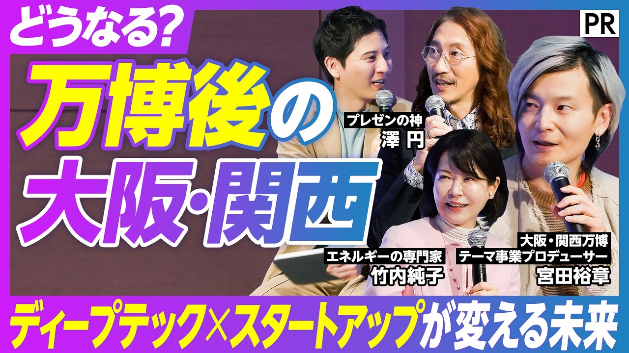 竹内純子・宮田裕章・澤円の3氏を前に、関西発ディープテックスタートアップ5社が核融合・再生医療・光化学・バイオ・波力発電の事業を披露した。