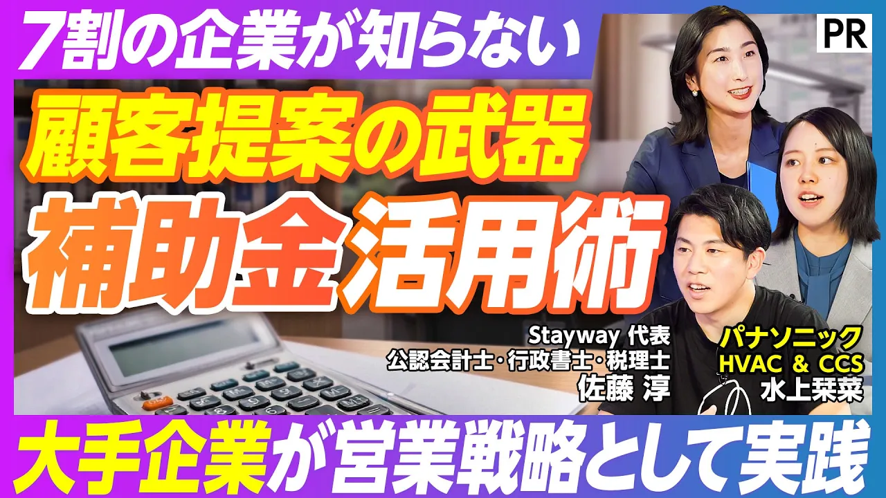 Stayway代表・佐藤淳が、補助金クラウドで「3つの壁」を崩し顧客提案の武器にする方法を解説し、パナソニック水上栞菜が導入効果を語った。